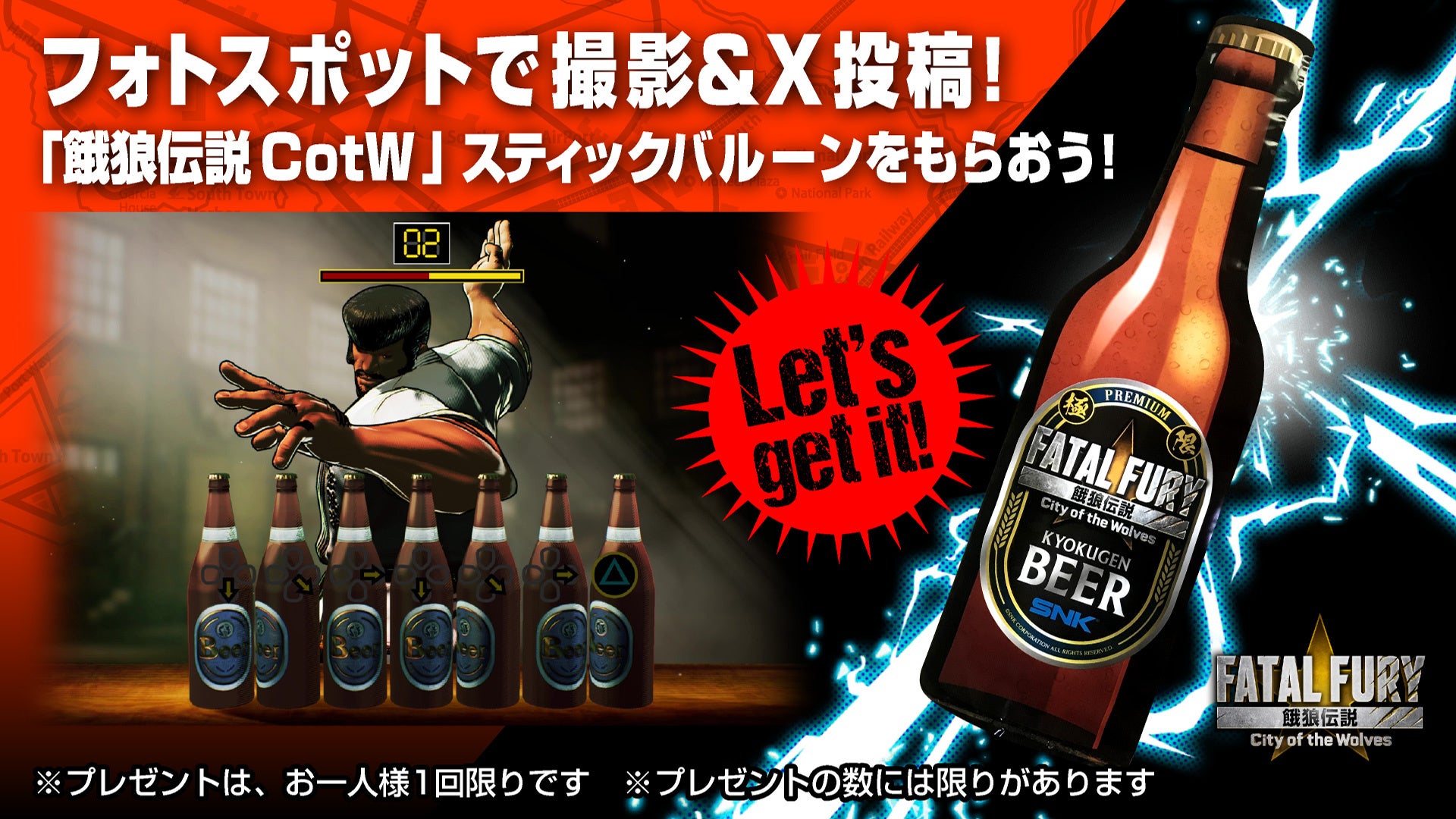 SNKブース内のフォトスポットで撮影した写真にハッシュタグ( #FatalFury )をつけてX(旧Twitter)に投稿すると、『餓狼伝説CotW』ステックバルーンをプレゼント。ぜひSNKブースにお越しください。