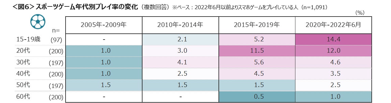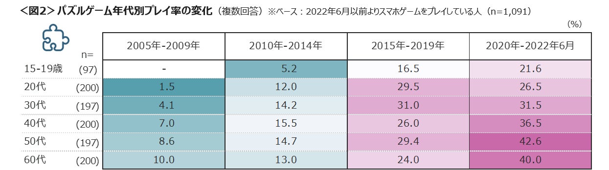 プレイ率TOP5のジャンルについて、年代別のプレイ率の変化を確認した。スマートフォンの普及が拡大していた2015年から「パズルゲーム」のプレイ率は上昇している。若年層から高年層まで全世代でのプレイ率が高めであり、特に50~60代の2020年~2022年6月のプレイ率は4割を超える。<図2>