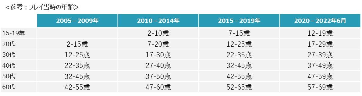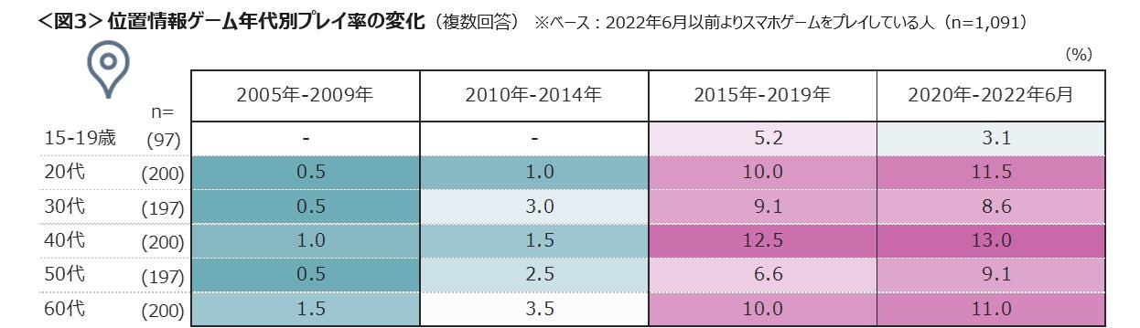 ポケモンGOやドラクエウォークに代表される「位置情報ゲーム」のプレイ率は現在の40代が高く、当時30代だったころにプレイ率が上がっている。全世代の2015年~現在までプレイ率は、大きく下がることなく継続的に推移している。<図3>