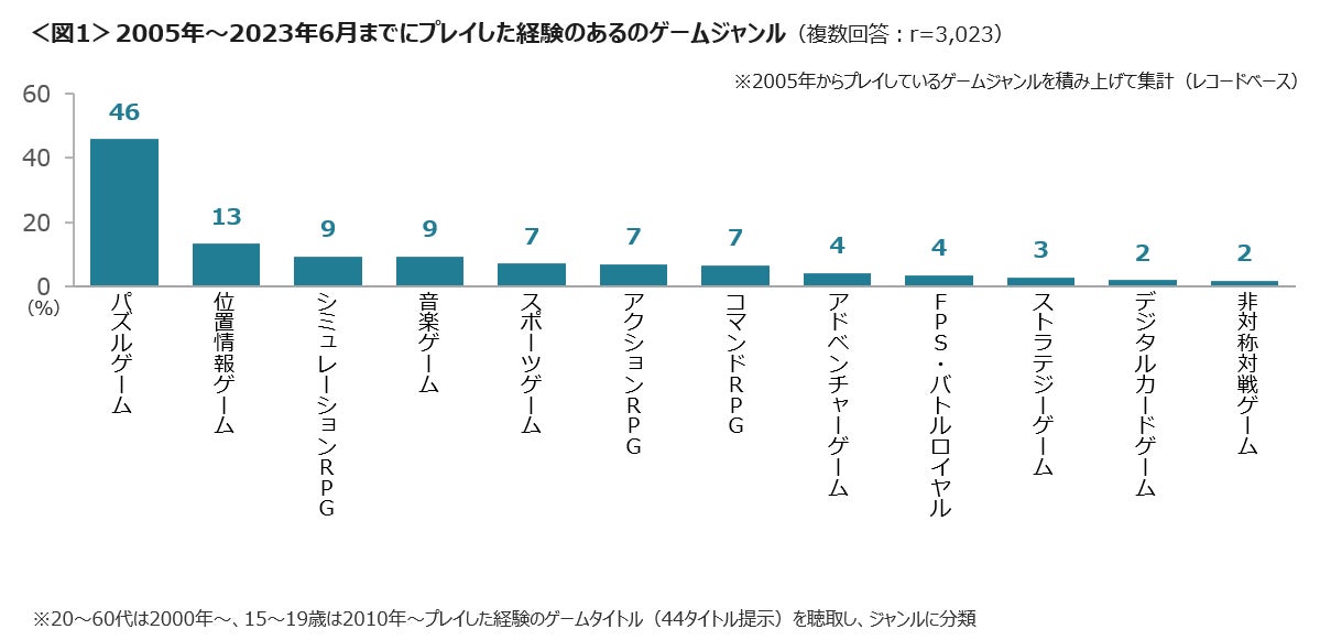 2005年から現在に至るまで、プレイした経験のあるジャンルを積み上げて集計(レコードベース)した結果、「パズルゲーム」が46%と突出して高い。次いで「位置情報ゲーム」13%、「シミュレーションRPG」9%、「音楽ゲーム」9%と続く。<図1>