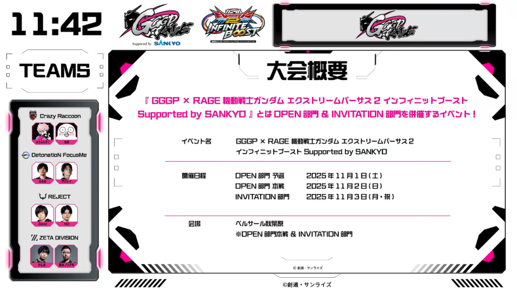 2025年11月3日、東京都・ベルサール秋葉原にて、「GGGP×RAGE 機動戦士ガンダム エクストリームバーサス2 インフィニットブースト Supported by SANKYO」(GGGP×RAGE EXVS2IB)INVITATION部門が行われました。