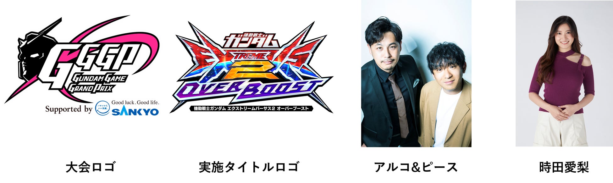 本大会の概要やGGGP史上最高額となる総額800万円の賞金、そして『機動戦士ガンダム エクストリームバーサス2 オーバーブースト』の特徴や見どころの紹介がMCより発表された後、本大会を盛り上げるスペシャルサポーターとして、時田愛梨さんとゲストのアルコ&ピース(平子祐希さんと酒井健太さん)が登壇しました。