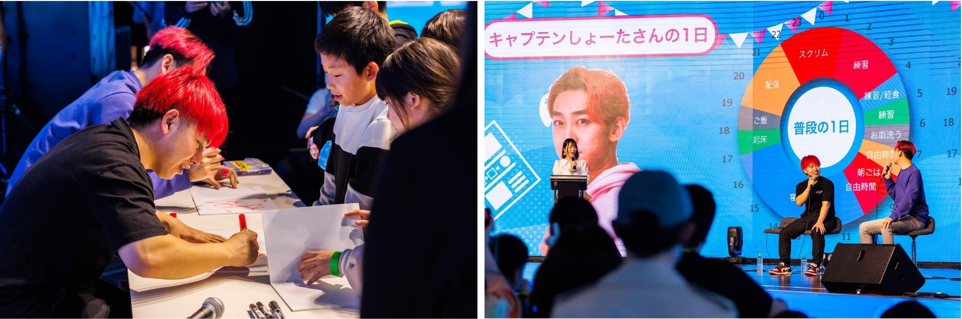 ステージ上では質問コーナー・じゃんけん大会・記念撮影などがおこなわれ、出演者との交流に子供たちが目を輝かせていました。ステージ終わりには、りあんさん、キャプテンしょーたさんがイベント会場内を回り、ファンと交流をし、一人ひとりにサインをしたり、写真を撮るなどファンサービスが行われました。近くで見る出演者たちに子供たちはとても喜んでおり、中にはYoutuberを目指す夢を語った子、eスポーツ選手になる夢を語った子も多く見受けられました。