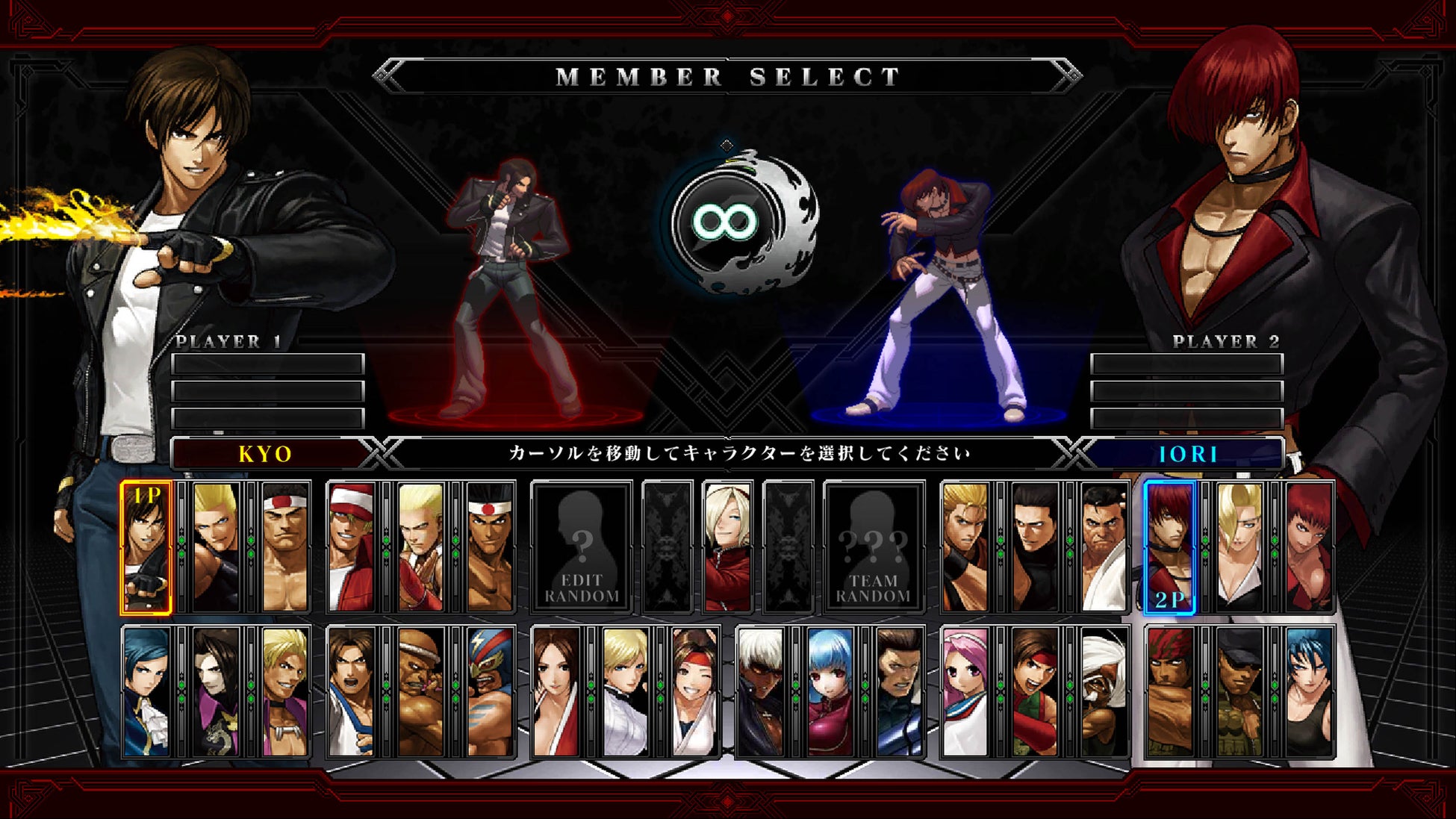 KOF歴代人気キャラクターや、物語の鍵を握るキャラクターに加え、『KOF XIII』発売当時はDLCキャラクターだった「ネスツスタイル京」、「炎を取り戻した庵」、「Mr.カラテ」を含めた総勢36キャラクターが使用可能。