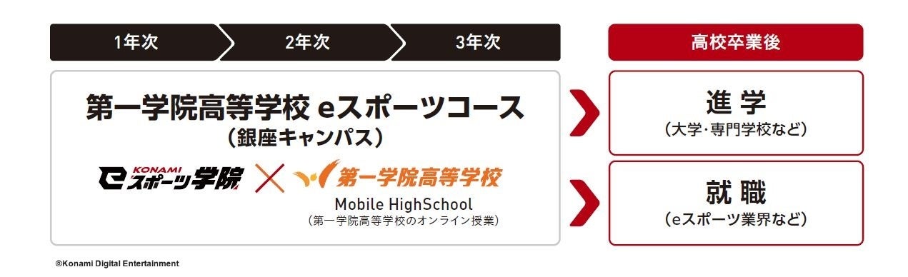 (※「KONAMI eスポーツ学院」は、「第一学院高等学校」のサポート校です。サポート校とは、高等学校通信教育を受けている生徒などに対して、学習に対する支援などを行う教育施設です。)