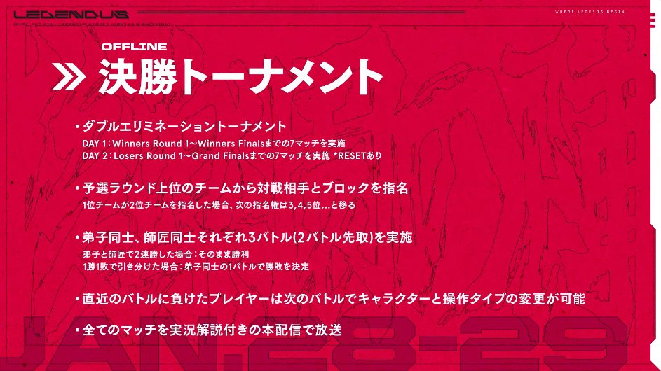 1月26日に行われた予選ラウンドの結果に基づき、1月28日からは決勝トーナメント戦が開幕。「ダブルエリミネーション形式」「弟子同士&師匠同士でそれぞれ3バトル実施」といったルールのもと、最強師弟の座をかけて各プレイヤーが火花を散らしました。