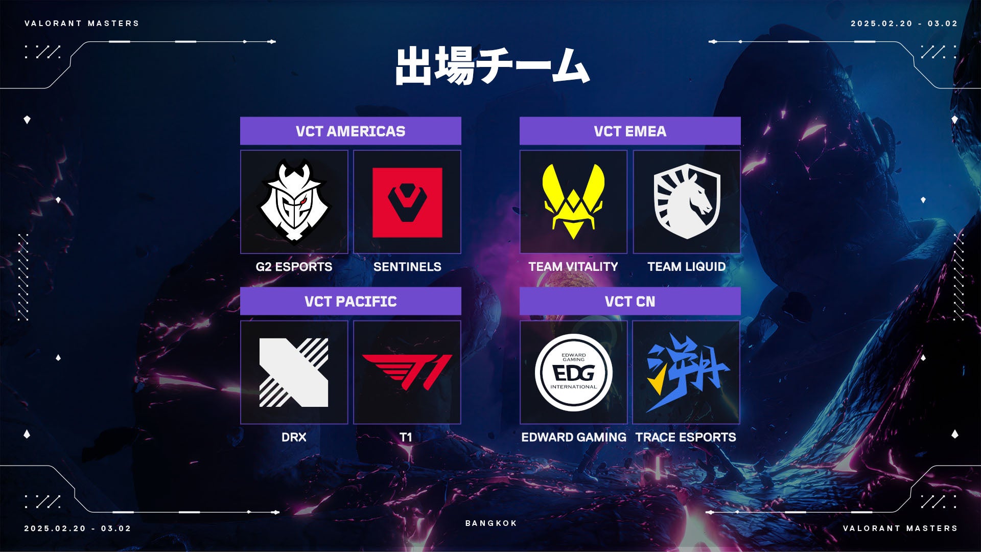 2025シーズンは、VCT Americas、VCT CN、VCT EMEA、VCT Pacificという4つのインターナショナルリーグで行われたKickoffトーナメントで幕を開けました。各リーグでは12のチーム同士が対戦を行い、それぞれ上位2チームが地域の代表としてバンコクに集います。