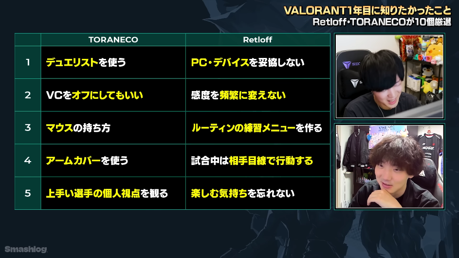 動画では上述の話題だけでなく、「デバイスを妥協しない」「試合中は常に相手目線で行動する」など、初心者でなくとも参考になるアドバイスが両名の口から語られています。意外と忘れがちな基礎知識を含め、「これからVALORANTを練習したい」「ランクが伸び悩んでいる」という方は、ぜひ一度目を通してみてはいかがでしょうか。