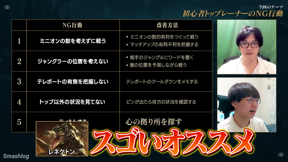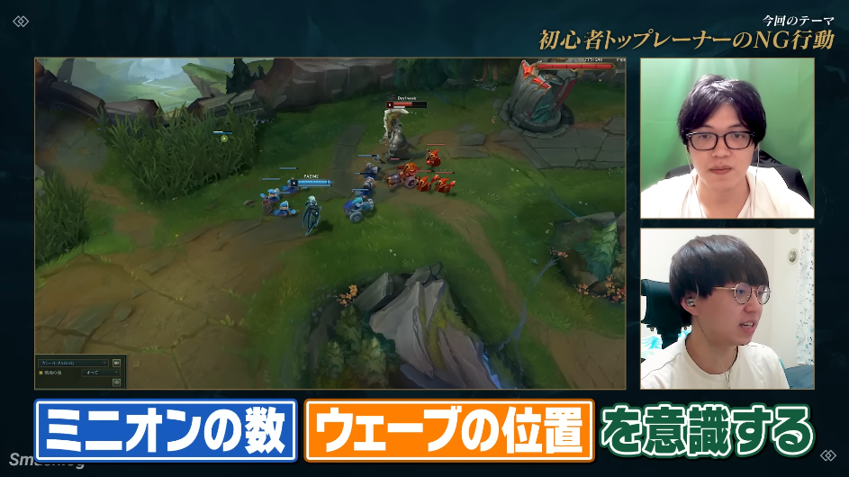動画の進行役を務めるのは、元プロゲーマーとして国内『LoL』競技シーンで活躍していた”Day1”さんと”Paz”さんです。今回はPazさんが講師となり、初心者TOPレーナーがやってしまいがちなNG行為を計5つ紹介しています。