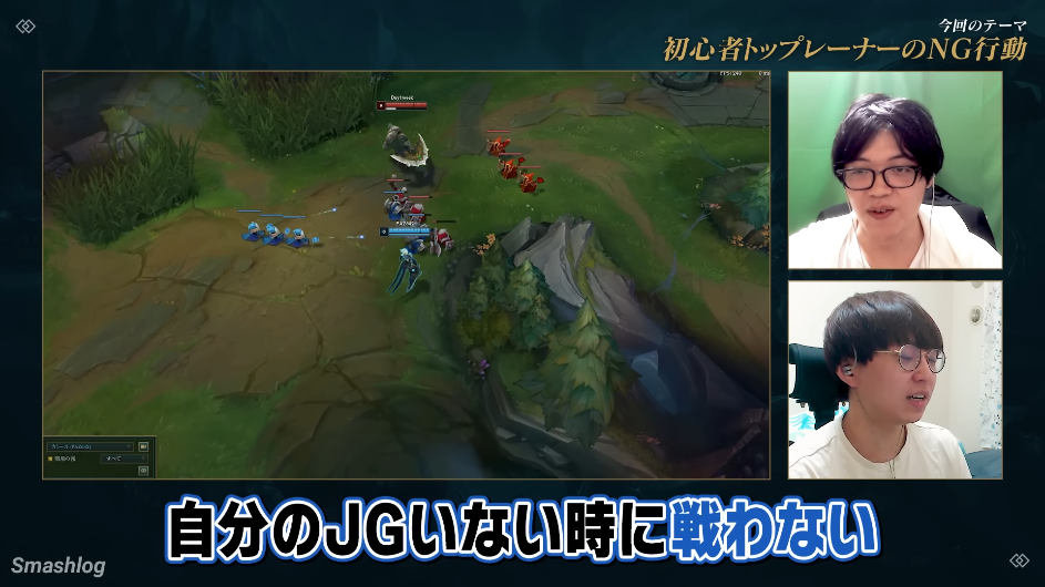 2つ目のNG行動は、「JGの位置を考えずにプレイする」こと。『LoL』において、JGは常にすべてのレーンに関与できる可能性を秘めたロール。「例えば味方JGがBOT側にいて、敵JGがTOP側にいる可能性が高い時に、敵に有利な状況で深く攻撃を仕掛けるのはすごく危険」だと語りました。