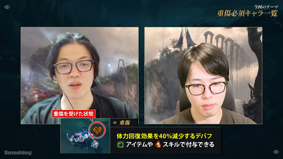 重傷とは、敵に付与するデバフ(弱体効果)の一つで、「相手の回復能力を40%減少させる(回復量を60%にする)」という強力な効果を持っています。動画の進行を務める”Day1”さん(元プロゲーマー)&”Jaeger”さん(eスポーツキャスター)も、「この効果をいつ、誰に使うかはベテランプレイヤーでも迷うことがある」とコメント。そのため、本動画は改めてその判断基準を明確にすることを目的としています。