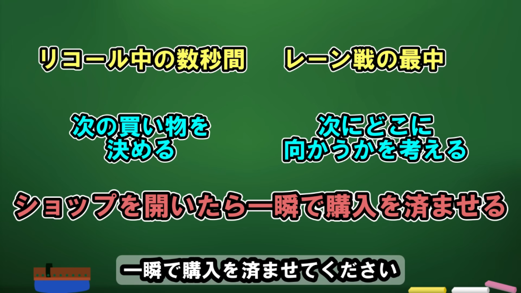 3つ目のポイントは、「ベースでの滞在時間を極限まで短縮する」ことであり、リコール中の数秒間やレーン戦の最中にあらかじめ購入するアイテムを決めておくことで、オブジェクト戦での有利なポジション取りやミニオンウェーブの損失防止に直結するようです。