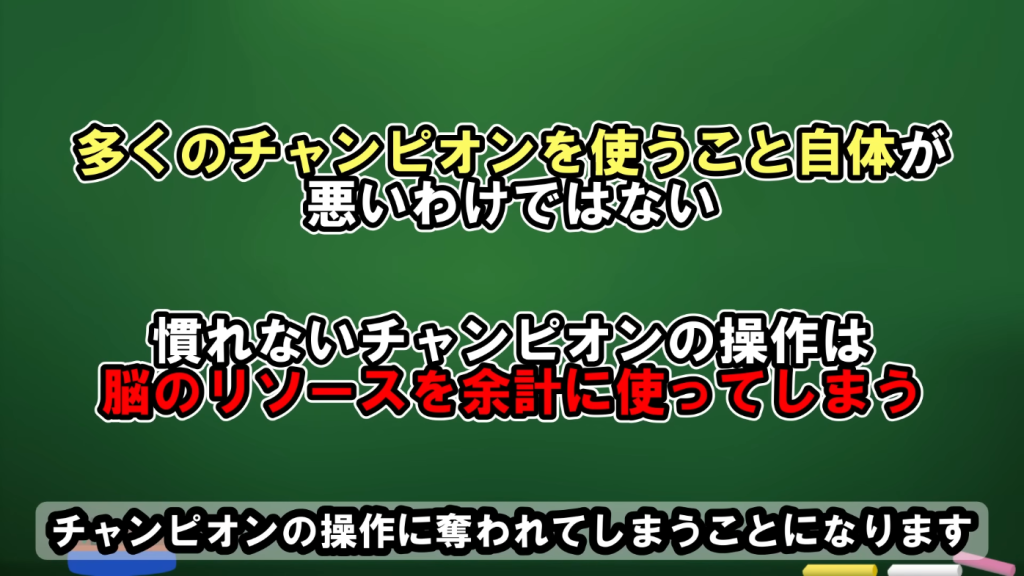 まず1つ目のポイントとして、「使用するチャンピオンのプールを3体程度に固定する」ことが推奨されています。チャンピオンの操作を無意識に行えるレベルまで習得することで、脳のリソースをマップの状況判断、敵のジャングラーの位置予測といった高度な情報処理に充てられるようになるとのことです。