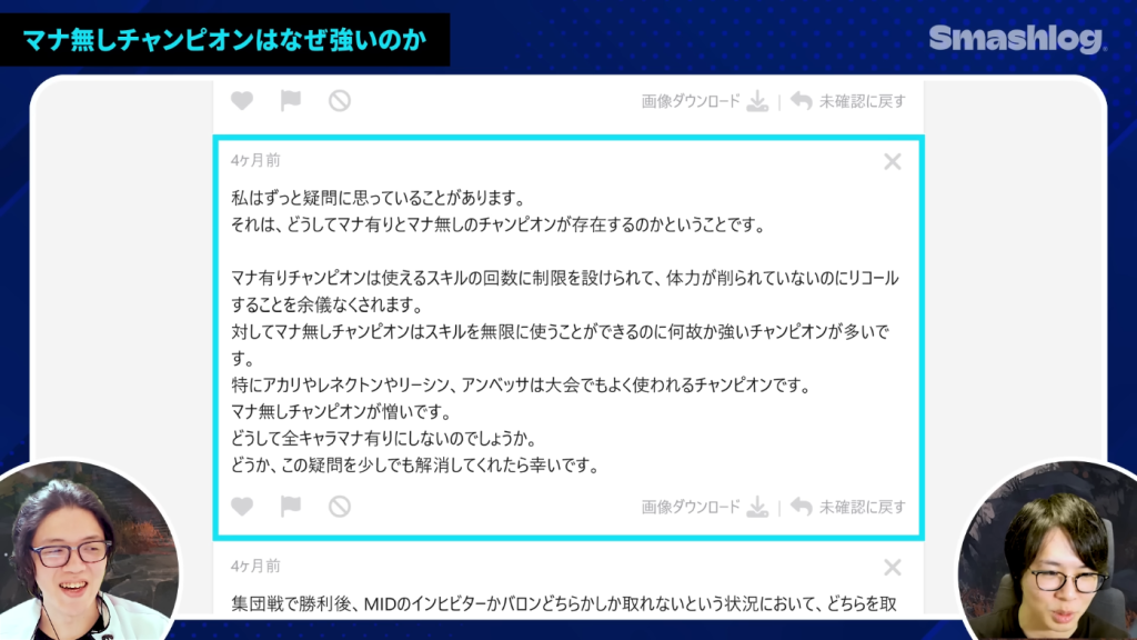 一方でマナ有チャンピオンは、「スキルのダメージが高めに設定されている」「クールダウンがそれほど長くないため、種類によっては連発できる」……等々、「マナが無いからといって必ずしも不利ではない」という見解を示しました。