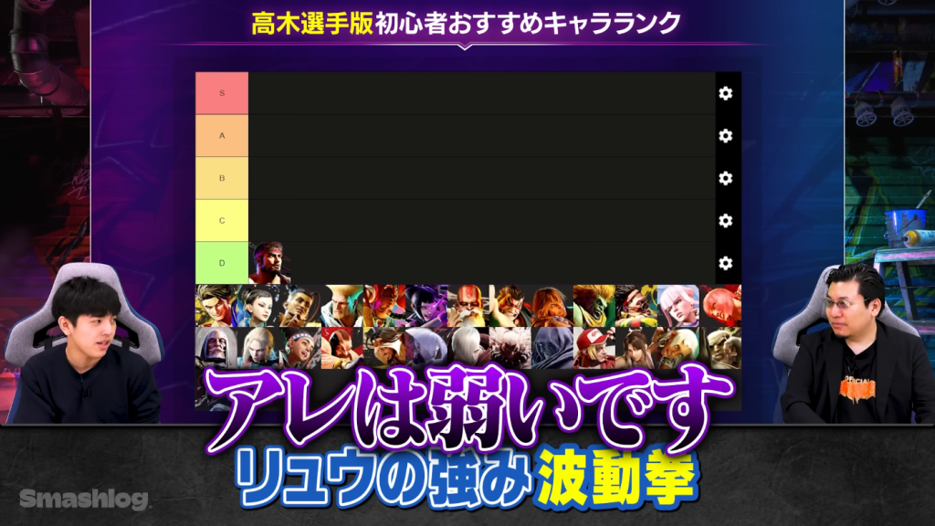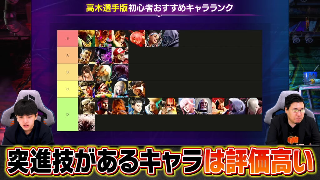 この動画の最大の見どころは、「スタンダードなキャラこそ初心者に最適」という従来の定説を真っ向から否定している点にあります。高木さんの理論によれば、伝統的な波動拳や昇龍拳を持つキャラクターは、むしろ初心者にとって「自爆のリスク」を孕んだ弱点になりかねません。昇龍拳は対空として出すにはコマンドが難しく、波動拳は不用意に撃つと相手の飛び込みから手痛いカウンターを食らってしまうため、リュウやケン、豪鬼といった人気キャラが最低評価のDランクに置かれるという格付けとなっています。