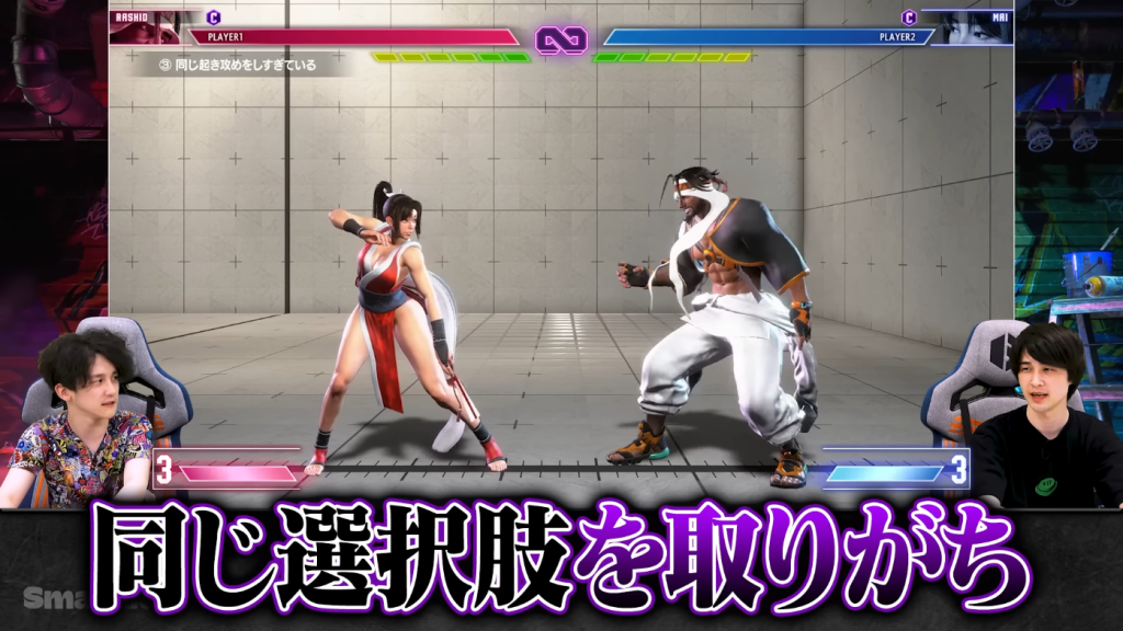 一方で、守りに偏りすぎてしまう傾向についても鋭く指摘されています。相手が何もしてこない時に自分もやることがなくなってしまうプレイヤーは、自キャラの根幹となる強力な攻めの起点を用意し、相手に何らかの対応を強制させる動きを取り入れるべき。全対応は不可能であることを受け入れ、自分だけが難しい対応を狙うのではなく、相手にも難しい判断を迫るという考え方が上達には欠かせません。
