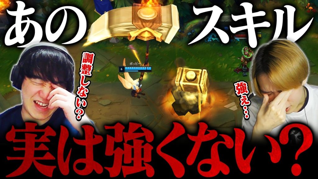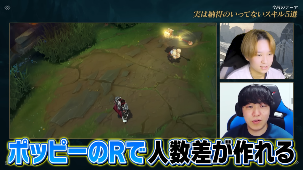 そして動画内でとりわけ両名が厄介だと指摘したのが、TOPやJG、SUPでも運用されるポッピーの各種スキル。ハンマーを叩きつけるR(守護者の鉄槌)は、フルチャージ時の吹き飛ばし距離が極めて長く、両名は「人数差が勝敗を分けるこのゲームで、一瞬で状況を覆せてしまう点は理不尽」とコメントしました。また、周囲でブリンクスキルを使おうとする相手を長時間弾き飛ばすW(ステッドファスト)が、特定のチャンピオンに対して過剰なプレッシャーを与えていると分析しました。