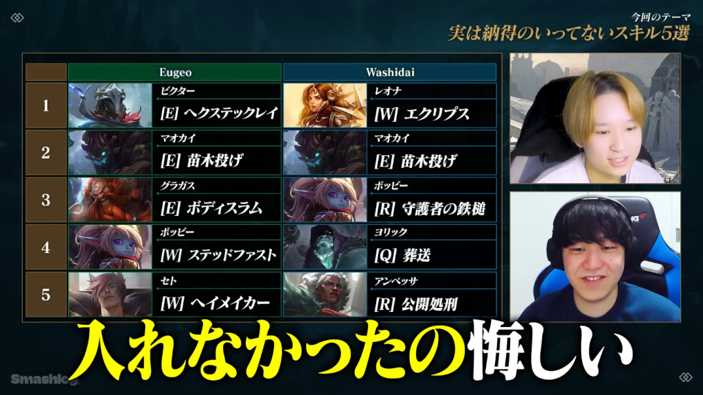 最終的に、Eugeoさんはピック段階から相手の選択肢を大きく狭めてしまうポッピー(W)を、Washidaiさんは設定上の矛盾を感じさせるヨリック(Q)を、それぞれ最も納得がいかないスキルとして選出し、動画を締めくくりました。日頃から頻繁にアップデートを繰り返すこそ、各チャンピオンのスキルに焦点が当たりやすい『LoL』においては、今後もバランス調整などメタ(ゲーム内環境)の変更から目が話せません。