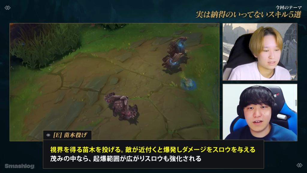 さらに、二人が共通して納得がいかないと声を揃えたのがマオカイのE(苗木投げ)です。ブッシュに苗木を投げるだけで視界を確保できるだけでなく、高いダメージとスロー効果まで付与されるため、もはや簡易的なワードとしての役割を大きく逸脱していると感じているようです。そのほか、ヨリックのQ(葬送)に関しては、最近のパッチで敵を殴るだけでグールが生成されるようになった変更に触れ、ストーリー設定として「敵の頭を殴って墓ができる」という状況自体がおかしいのではないかと疑問を投げかけました。