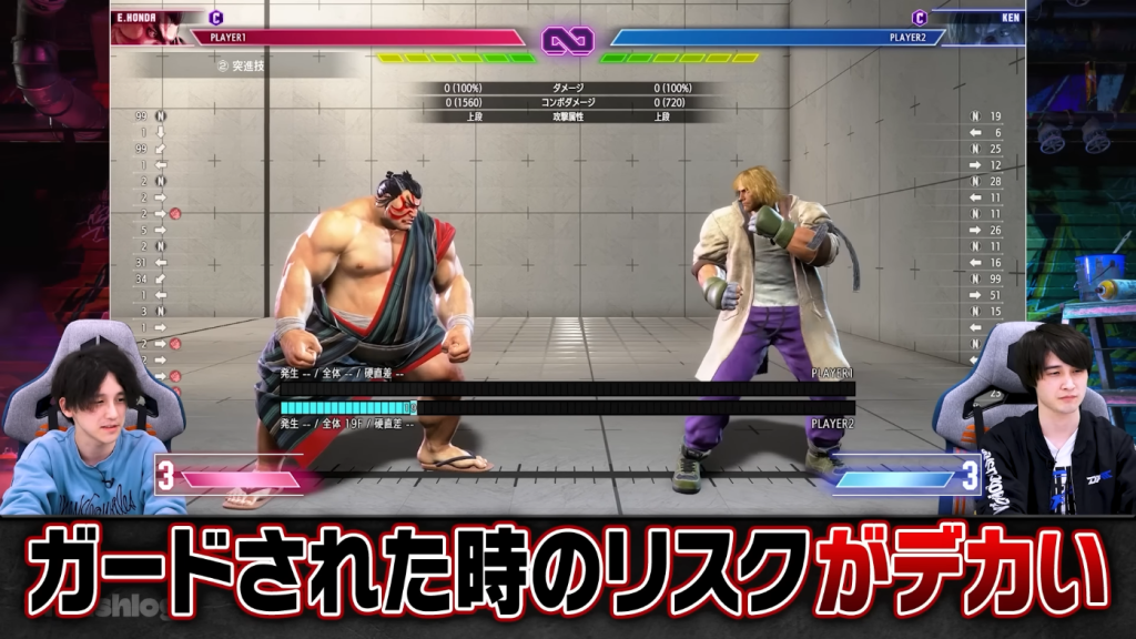 次に、エドモンド本田の頭突きに代表される強力な「突進技」への対処です。これらは一見すると隙がないように見えますが、基本的にはしっかりとガードを固めることが最優先の正解となります。