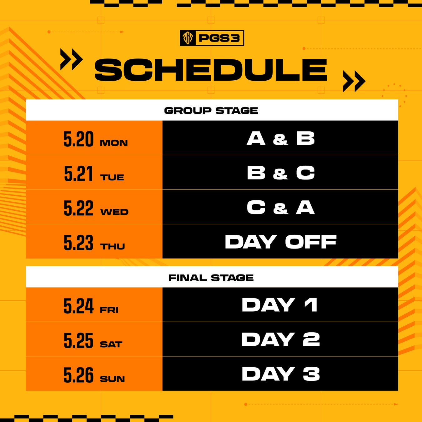 グループステージの上位16チームがファイナルステージに進出し、1日の休憩を挟んで5月24日から26日までの3日間、合計18試合が行われます。これらの試合の最終ランキングで最も高いチームがPGS 3のチャンピオンに輝きます。