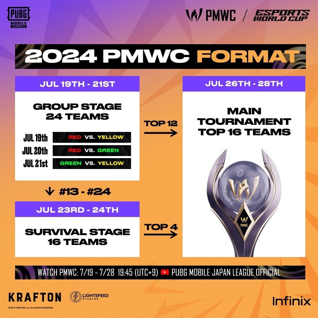 2024 PMWCは、7月19日(金)から21日(日)まで行われるGROUP STAGEから幕を開け、GROUP STAGEでは24チームが8チームずつ3つのグループに分けられ、1日目にはGROUP REDとGROUP YELLOW、2日目にはGROUP GREENとGROUP RED、3日目にはGROUP YELLOWとGROUP GREENがそれぞれ6試合ずつ行い、各グループで合計12試合が行われます。