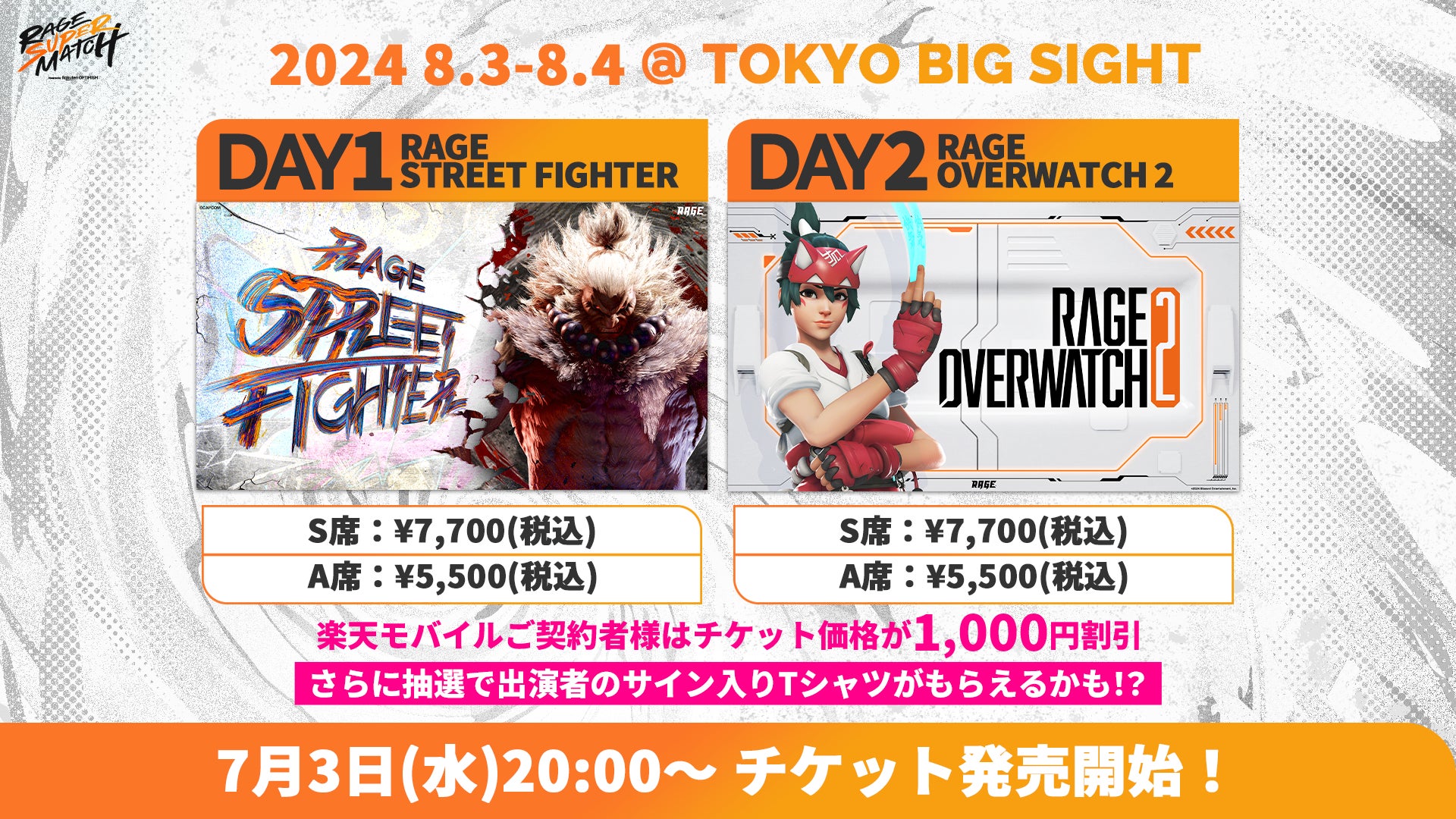 本イベントでは、2024年3月にRAGE初採用となり、好評を博した「STREET FIGHTER 6」に続き、RAGEでは初となるタイトル「Overwatch 2」を採用し、ここでしか見られない“奇跡のマッチアップ”が実現いたしました。開催にあたって、各タイトルのメインステージコンテンツと出演者、コミュニティエリアの情報に加え、券売情報をお知らせします。チケットは2024年7月3日(水)20:00から楽天チケットにて販売を開始します。