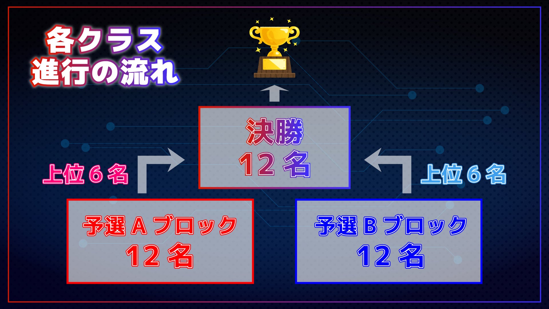 各クラス合計24名が2ブロックに分かれてレースを行い、各ブロックの上位6名が決勝レースに進出し、決勝レースの順位がそのまま最終順位となります。
