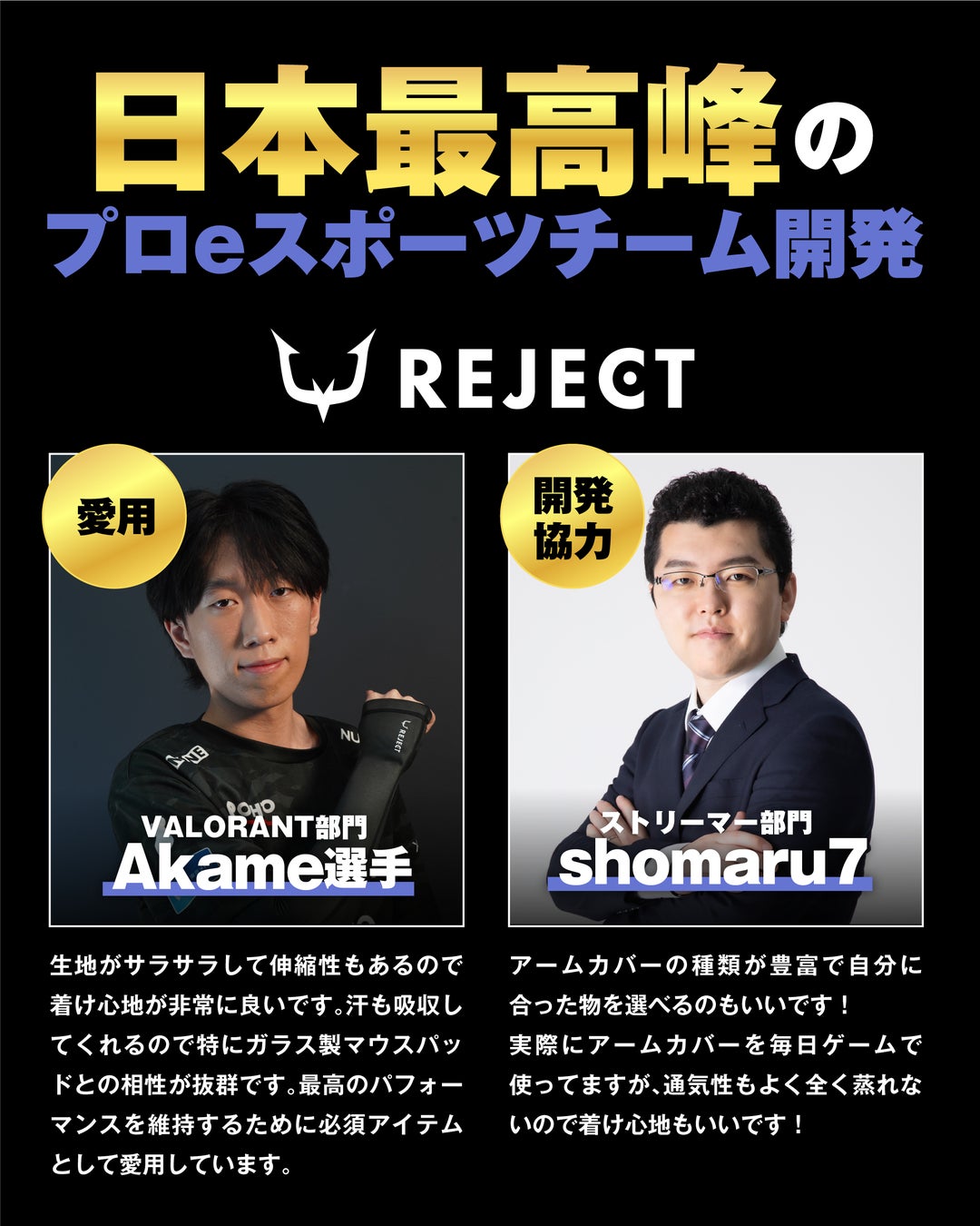 既にAmazonでベストセラー商品としてご好評いただいている「REJECT指サック」に次ぐ、REJECTが開発するプロ仕様プロダクトの第二弾「REJECTアームカバー」です。国内で大躍進を遂げているVALORANT部門やAPEX部門に所属する選手が、実際に競技中に使用しているアームカバーです。