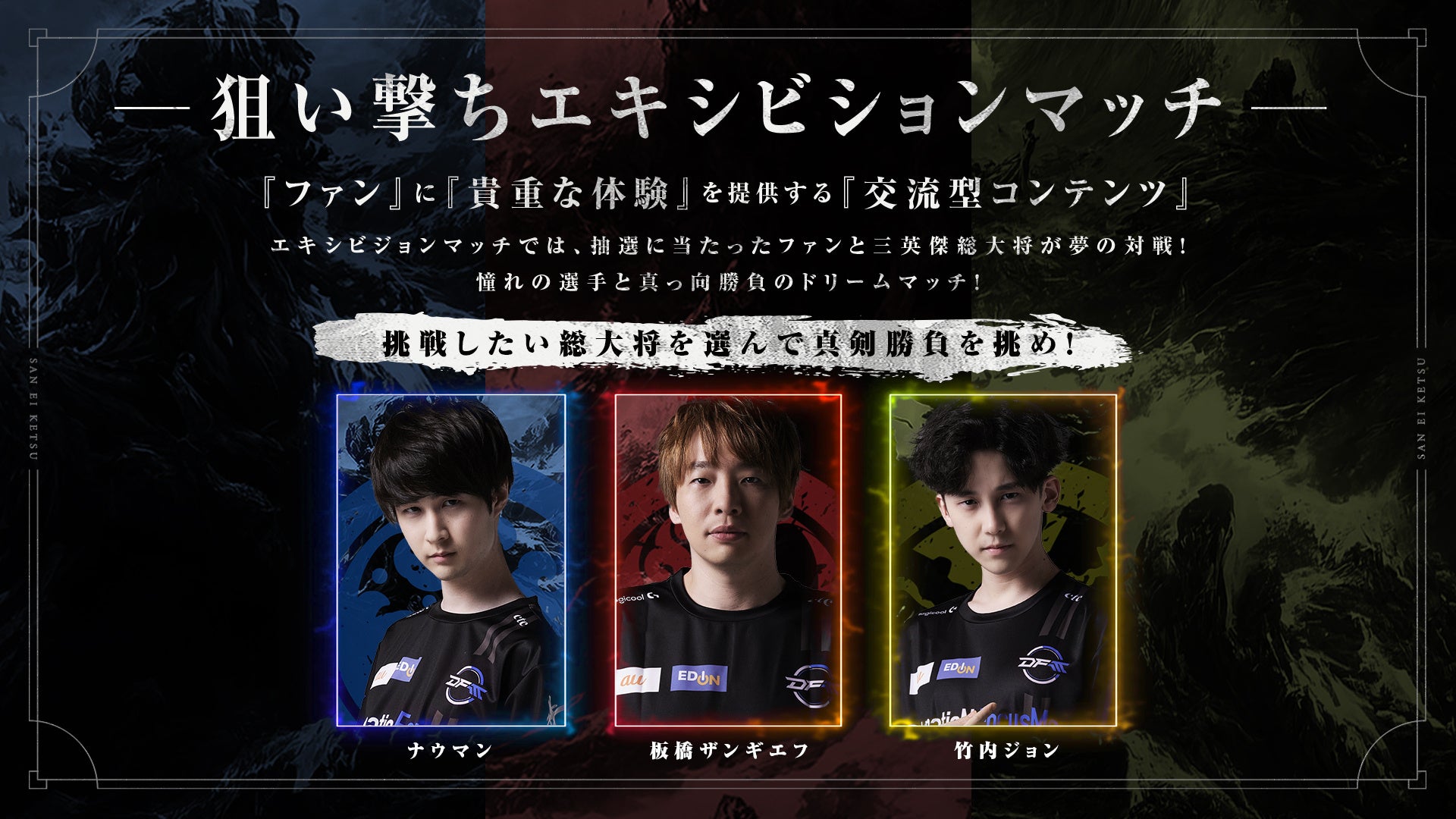 ・本イベントでは、「三英傑」をモチーフとし、「DetonatioN FocusMe」所属プロ選手が3つのチームのリーダー「三英傑」となり競います。プロ選手とゲーム実況を行う人気ストリーマーがドラフト形式で4人1組の3チームに分かれ、3つの種目で対戦します。プロ選手とストリーマー総勢12名による、本イベントでしか見ることができない対戦をぜひお楽しみください。