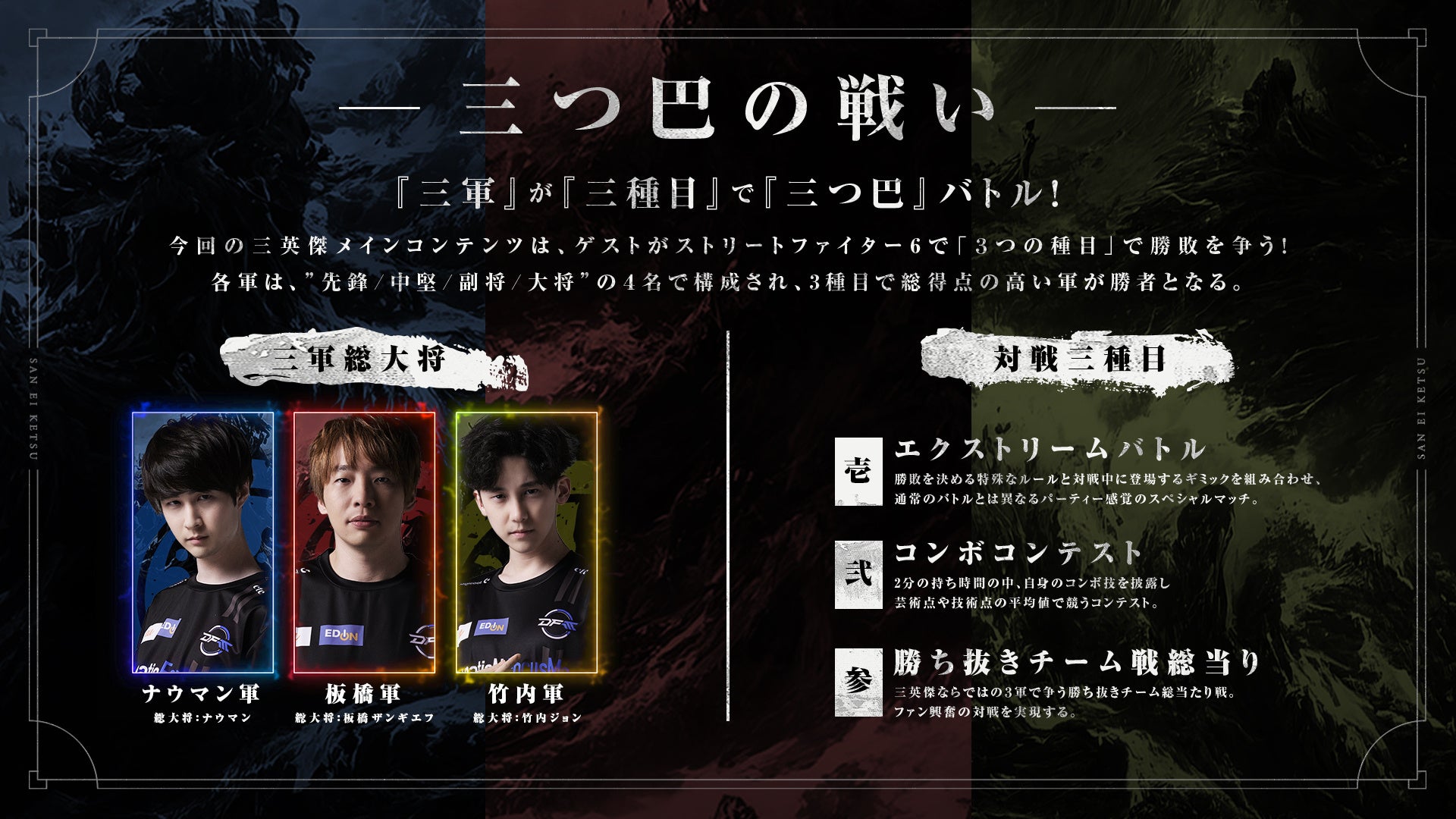 DetonatioNが運営するプロeスポーツチーム「DetonatioN FocusMe」所属の人気選手が3つのチームのリーダー「三英傑」となり、話題の王道対戦格闘ゲームタイトル「ストリートファイター6」の3つの種目で対戦するリーグ戦を行います。