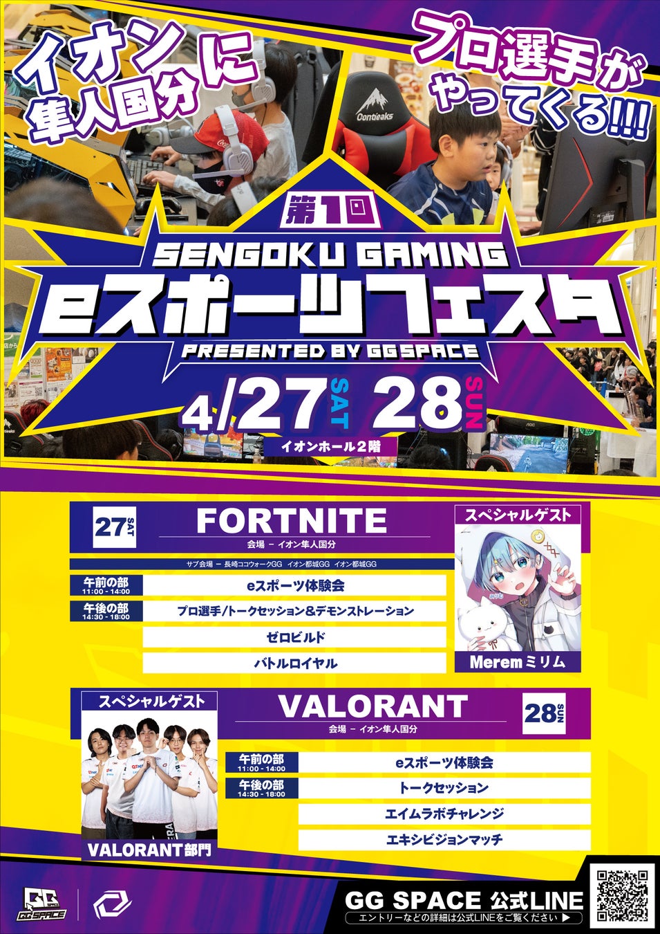 イベントでは、GGSPACE隼人店を本会場として、FORTNITE部門のMerem選手を招いたトークセッションやGGSPACEイオン都城店を含む各店舗からオンラインで参加が可能なFORTNITEカスタムマッチを行いますので、是非ご参加ください。