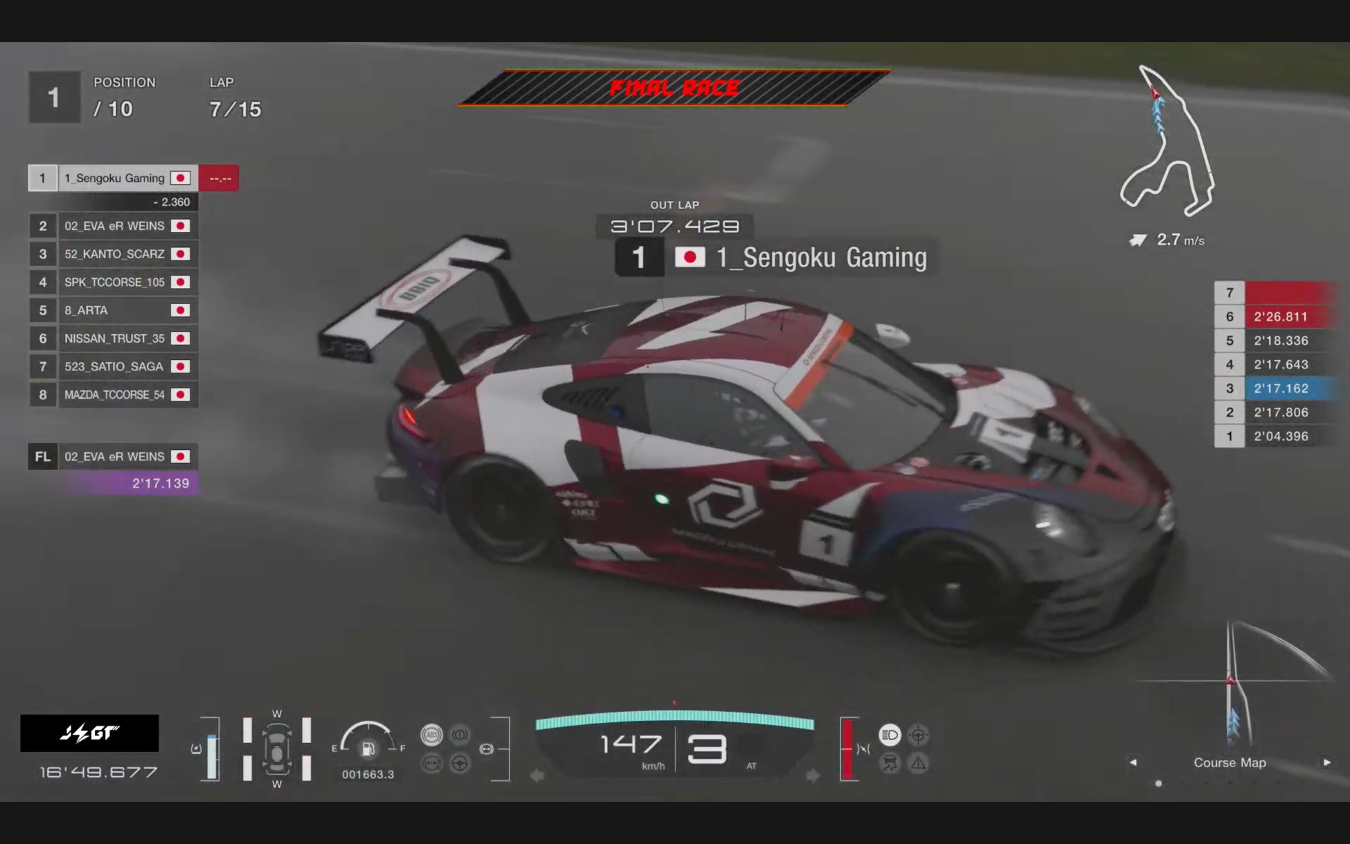 上位を狙うことができるポジションを獲得したSengoku Gamingは、ベルギーのスパ・フランコルシャンを全15周するレースで、天候が雨予報という先が読めないレギュレーションの中、雨が降るタイミング・雨量・路面状況を的確に読みながらドライバー・タイヤ交代を行う戦略が功を奏し、最終走者の小林選手が12周目でトップに躍り出ます。