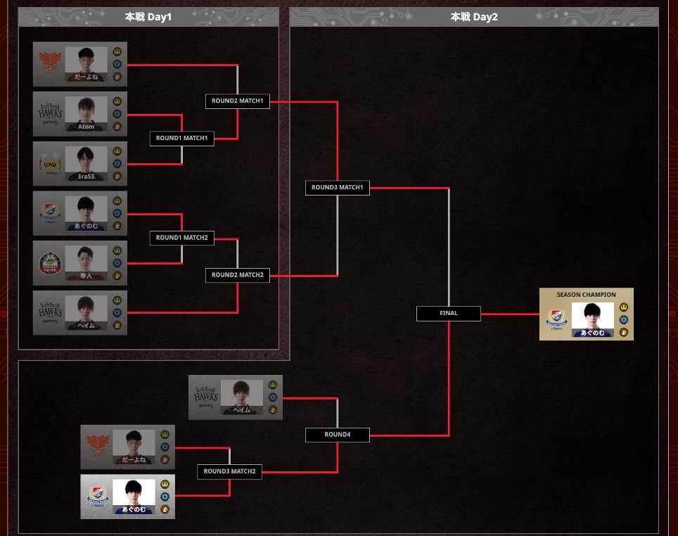 どちらが勝利しても今シーズン初優勝となる両者によるローテーション FINALは、Atom選手が先取します。しかし、2試合を通じて調子を上げてきたあぐのむ選手がそこから勝ち続け、最終的には1-3で勝利。ROUND3後に宣言した通り、福岡ソフトバンクホークス ゲーミングのふたりを倒し、シーズン初優勝を果たしたあぐのむ選手は満面の笑みで「自分でも信じられない」と率直な感想を述べます。インフルエンサーとして配信し、別の仕事もこなす社会人である彼は、「限られた時間を練習にあてられた。学生や仕事している人も、諦めずにプレイしていたら何かいい結果が得られると思う」と視聴者にメッセージを送りました。