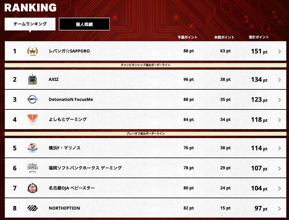 本戦後には、4th Season終了時点でのチーム順位が発表されました。3rd Seasonまで首位を抑えていたレバンガ☆SAPPOROや2位のAXIZの選手がDay2に残れなかったこともあり、3位以下とのポイント差がグッと縮まり、年間順位が決まる5th Seasonの行方が気になる混戦模様となりました。5th Seasonの予選は12月2日(土)、本戦は12月23日(土)、12月24日(日)に行われます。