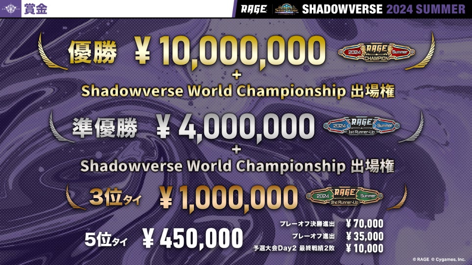 株式会社CyberZ、エイベックス・エンタテインメント株式会社、株式会社テレビ朝⽇が運営する国内最⼤級のeスポーツエンターテインメント「RAGE(レイジ)」は、対戦型オンラインTCG(Trading Card Game)『Shadowverse』の大会「RAGE Shadowverse 2024 Summer」予選大会を2024年5月4日(土)から2024年5月5日(日)に幕張メッセ9ホールにて開催します。会場では30回目のオープン大会というメモリアルなタイミングならではの一般来場者も楽しめるサイドイベントやキャンペーンを実施いたします。