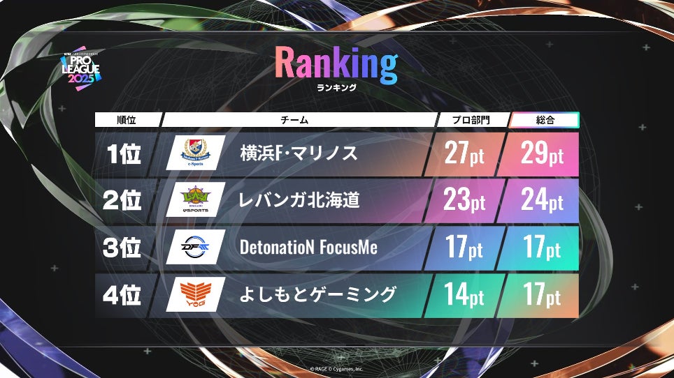国内最⼤級のeスポーツブランド「RAGE(レイジ)」は、対戦型オンラインデジタルカードゲーム『Shadowverse: Worlds Beyond』を競技タイトルとした新プロリーグ「RAGE Shadowverse Pro League 2025」の第2節(2nd Season)を2025年9月13日(土)にオンラインにて実施し、決勝戦を制した 横浜F・マリノス が第2節の頂点に立ちました。また、第2節MVPは横浜F・マリノスの あぐのむ選手 が獲得しました。熱戦が繰り広げられたこの節のレポートを以下ご報告いたします。