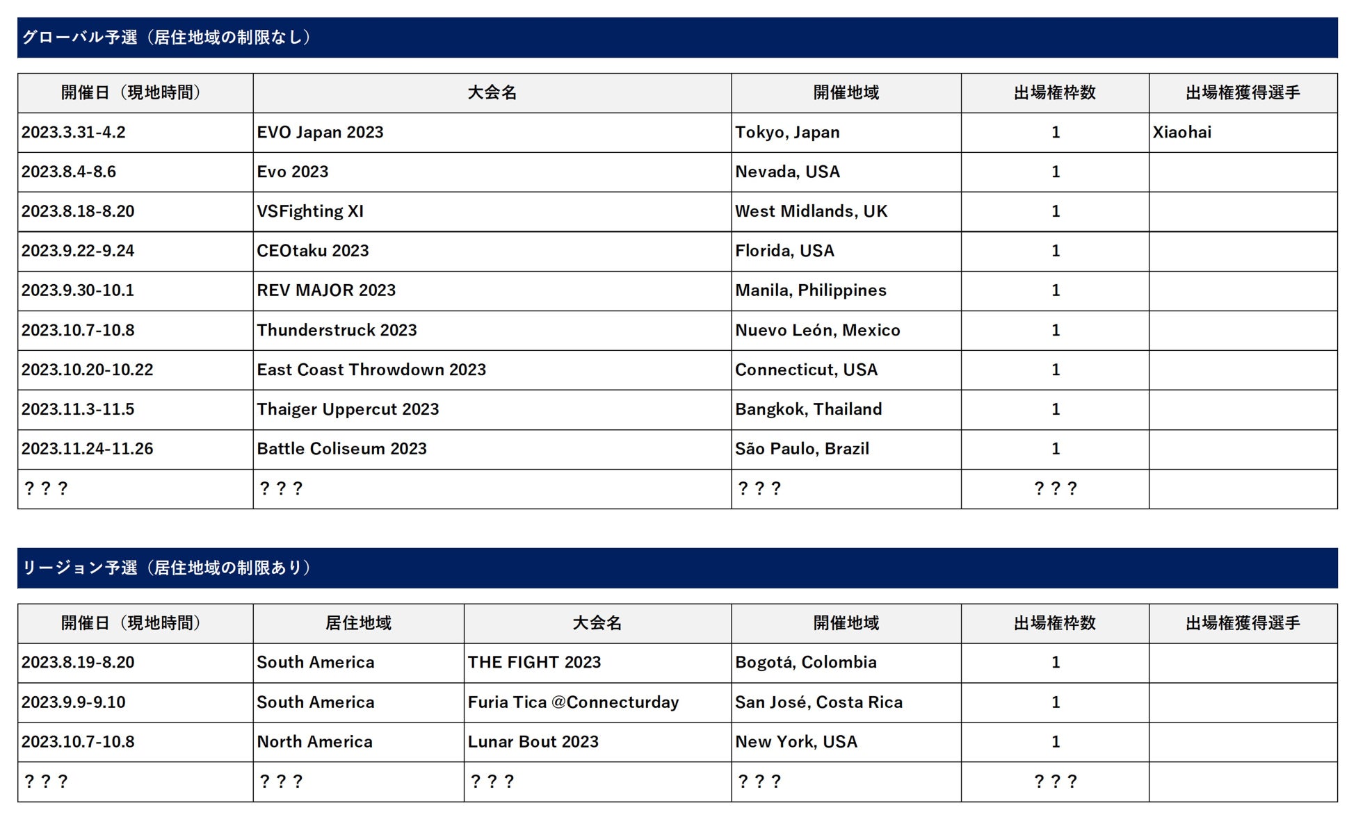 ・予選大会には、決勝大会出場権を得られる選手の居住地域の制限がある「リージョン予選」と、居住地域の制限がない「グローバル予選」があります。
