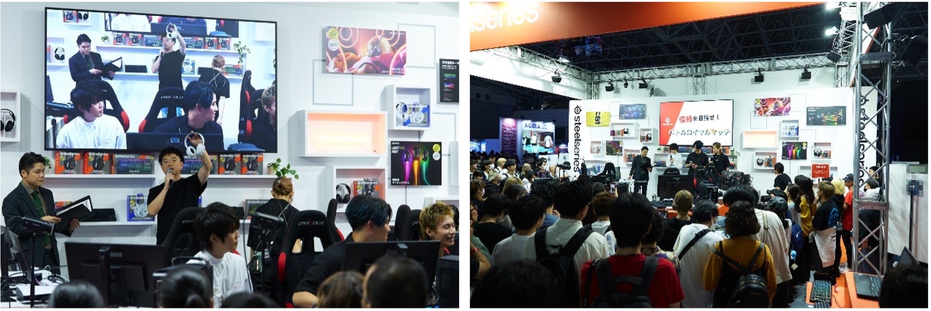 SteelSeriesのブースでは、ビジネスデイ、一般公開日ともに、全ての来場者の方に楽しんでいただくため、人気ストリーマーやプロ選手など豪華ゲストをお招きしたステージコンテンツをたくさん用意し、SteelSeries Japan公式YouTubeチャンネルでリアルタイム配信を行いました。