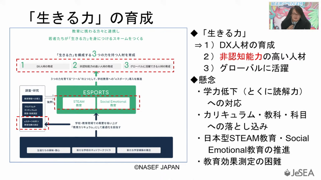 日本における青少年の教育課題として、先進国の中で著しく高い自死率や自己肯定感の低さが挙げられており、これらを解決する手段としてeスポーツを通じた「非認知能力」の育成が注目されています。