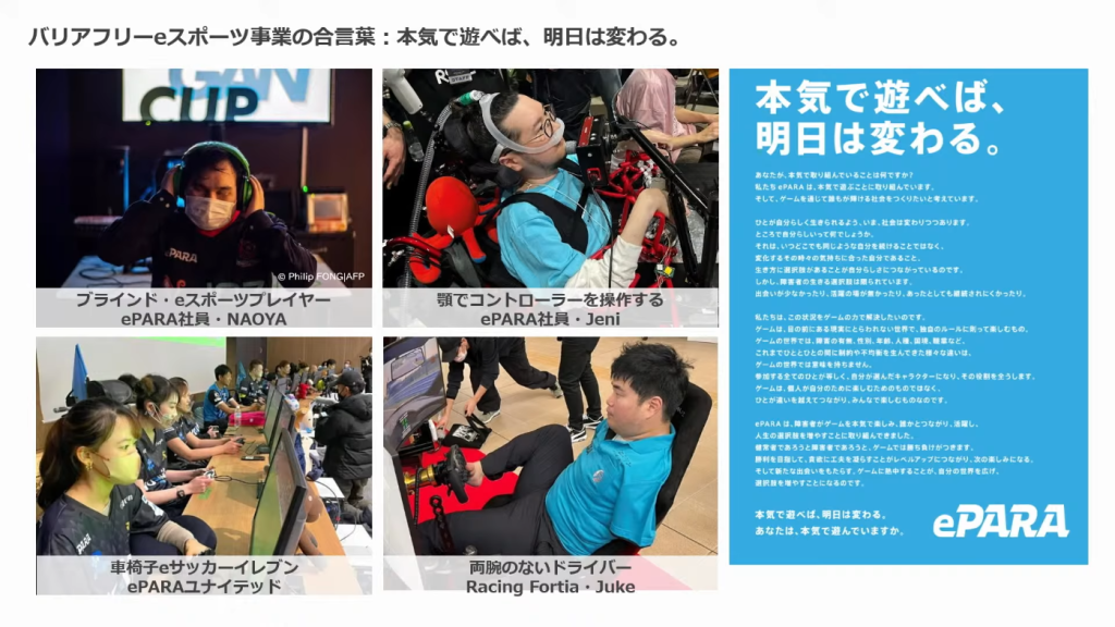 「バリアフリーeスポーツ」を提唱する株式会社ePARAの加藤氏は、年齢、性別、国籍、そして障害の有無に関わらず誰もが活躍できる社会の実現に向けた取り組みを報告しました。
