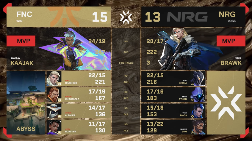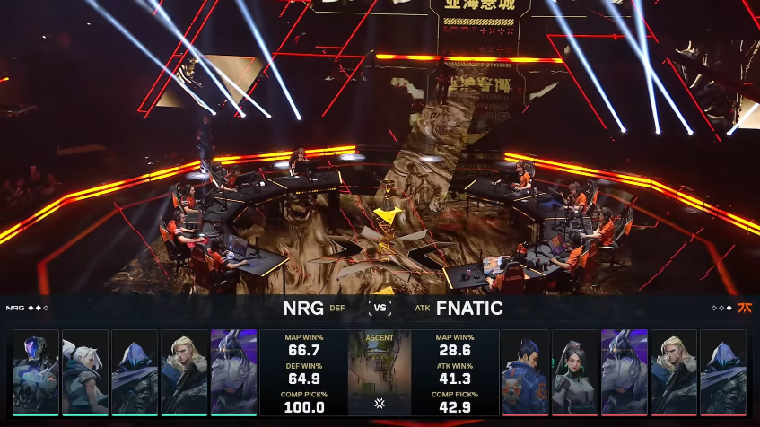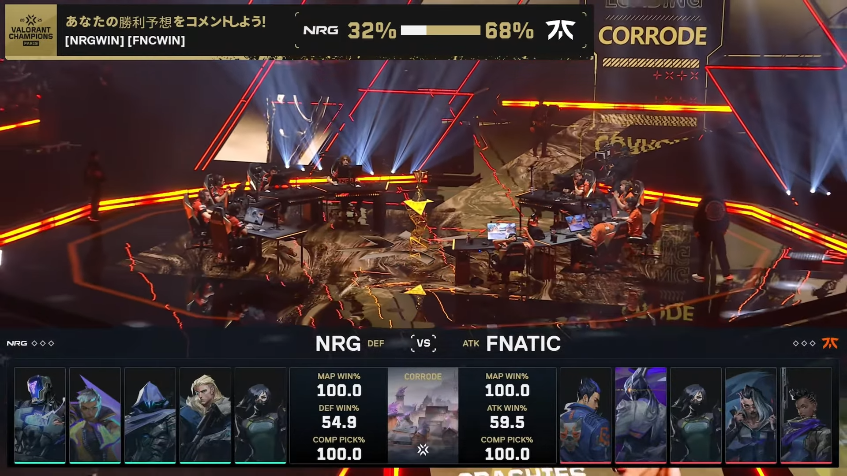 プレイオフはダブルエリミネーショントーナメントで展開。決勝戦はBo5形式で実施され、これまでの激戦をくぐり抜けた「Fnatic」(ヨーロッパ)と「NRG」(アメリカ)が激突。2025年度における『VALORANT』王者を決定づける戦いに挑みました。
