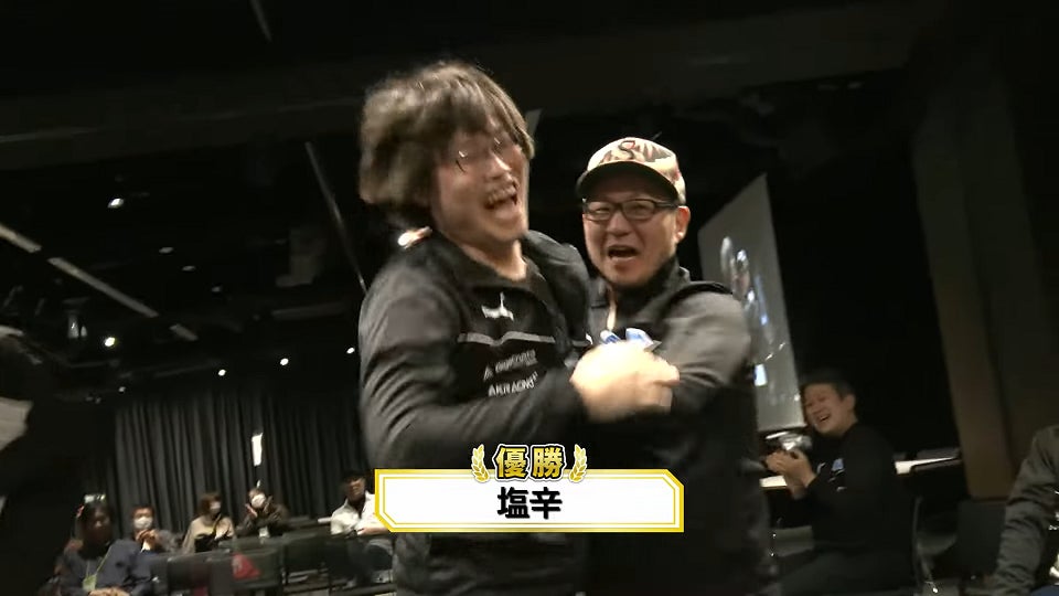 本大会で優勝を勝ち取ったのは塩辛選手。塩辛選手は、ルーザーズサイドからプロ選手のヨゴ選手を下して予選を勝ち上がり、決勝トーナメントでも並み居る強豪を跳ねのけ優勝の栄冠を手にしました。