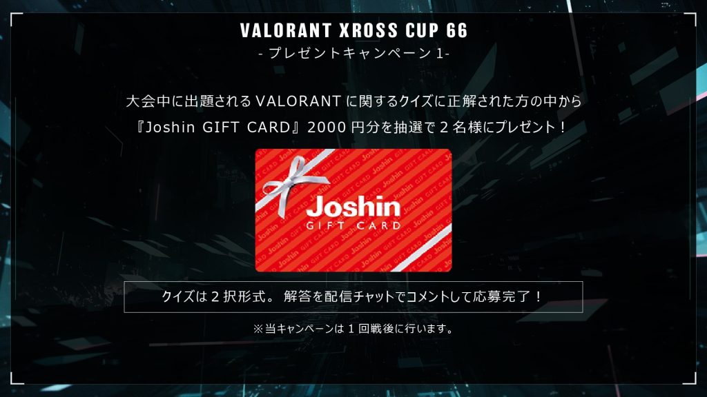 今大会も配信中にプレゼントキャンペーン企画を行います。配信中に出題される2択のクイズに正解した方の中から2名様にJoshinギフトカード2,000円分、1名様に『REALFORCE KEYBOARD』をプレゼント。答えが分からなくても、2分の1で正解しますので、皆さんの回答お待ちしております。